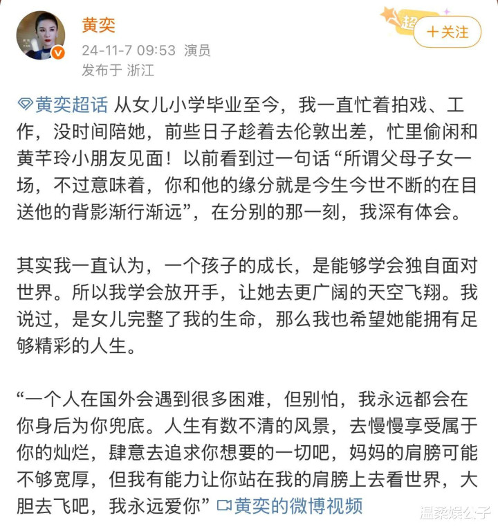 因为独生女黄芊玲,是黄奕的唯一,所以她说女儿是自己的全世界,认为女儿是自己余生最大的寄托和勇气。