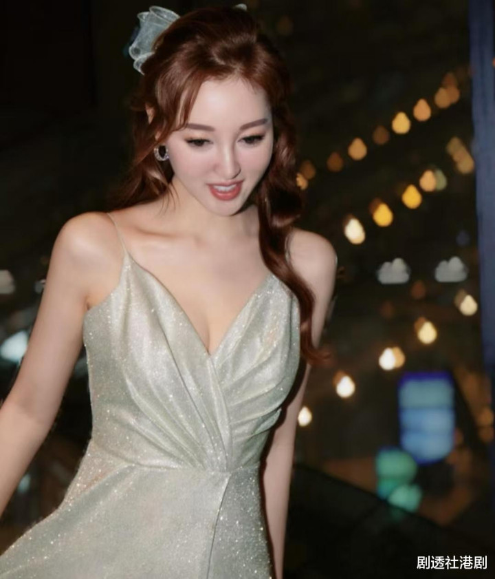照片中见到何艳娟身穿着一条香槟色的吊带连衣裙,款式简约但又不失贵气,何艳娟更是微露事业线,很是吸睛。