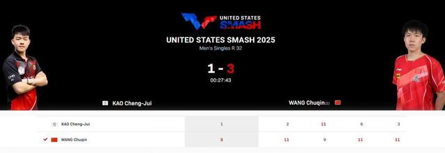 2025年7月9日,WTT美国大满贯男单1/16决赛赛场上,一场紧张刺激的对决扣人心弦。国乒主力王楚钦与中国台北选手高承睿狭路相逢,最终王楚钦以3-1的比分成功晋级16强,四局比分分别为11-2、9-11、11-6、11-3 ,总耗时27分43秒。这场比赛不仅是球技的较量,更是心理素质与战术调整能力的考验。
