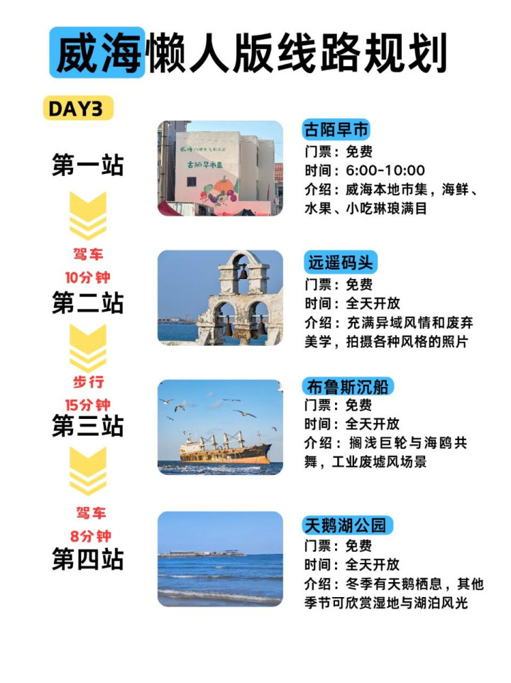 4️⃣图片上三是日游,第四天还想接着玩的话可以坐船去鸡鸣岛或者华夏城等景区,这几个景点需要收费,但是一个景点就可以玩一天,坐船的时候还可以在船上用火腿肠喂海鸥,互动感拉满