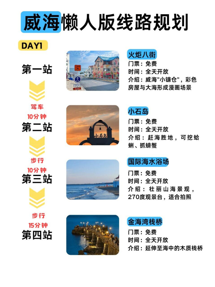 2️⃣如果是在威海北站下车的话推荐定国际海水浴场附近的酒店,傍晚可以在海水浴场看场日落,如果是在威海站下车的话,可以定韩乐坊附近或者威高广场【幸福门】附近的酒店。韩乐坊美食很多,就是夜市上的东西价格较高,夏天人流量也比较大;威高广场是威海本地人最常逛的商场,附近的威海大世界也有一些特色小吃和威海特产店,方便给亲朋好友带一些伴手礼。