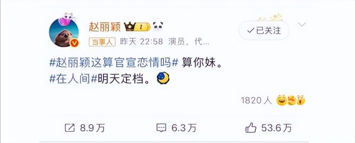 热搜“赵丽颖算是默认恋情了吗”的词条出现后,她回应道,算你妹。