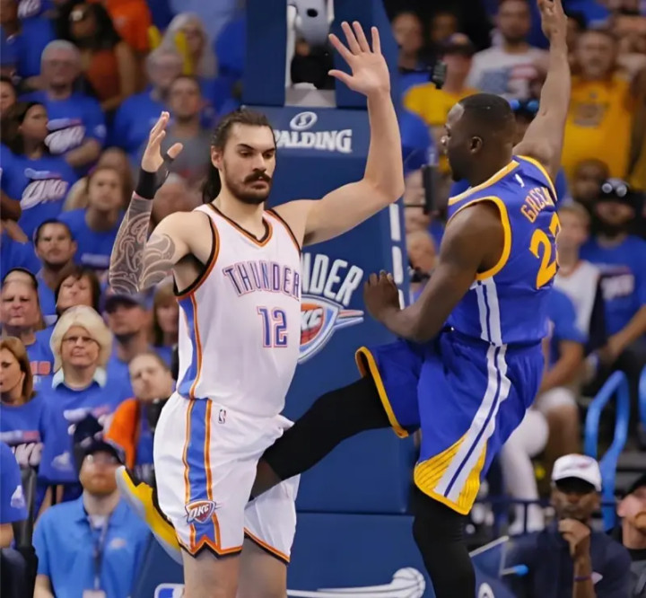 先说“内线高度不足”的短板。当时的雷霆,拥有亚当斯与“软特”组成的“双塔阵容”。亚当斯身高2米13,擅长篮板保护与内线卡位;“软特”身高2米11,具备极强的内线终结能力与篮板嗅觉。面对勇士“死亡五小”的小个子内线,雷霆的双塔战术几乎形成了“降维打击”。加之杜兰特、威少、伊巴卡和罗伯森同样拼抢积极,西部决赛前四场,雷霆场均抢下48.5个篮板,比勇士多出7.8个,其中前场篮板更是以14.0个对8.5个形成碾压;而在赢下的三场比赛中,雷霆场均抢下51.5个篮板,其中前场篮板14.8个;场均净胜勇士篮板10.5个,其中前场篮板净胜7.3个。