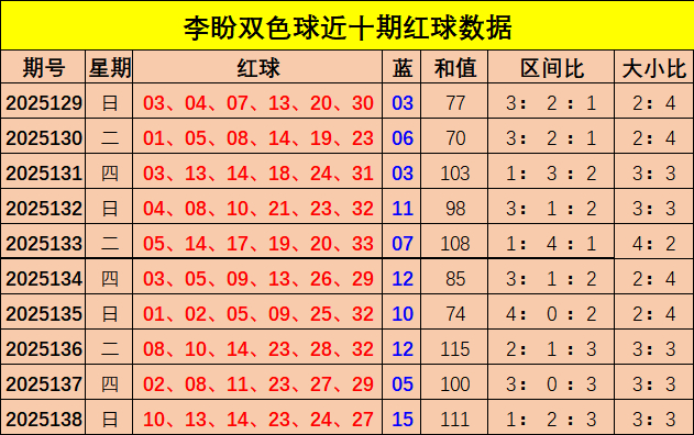 和值分析:上期红球和值111,近5期红球和值100以上3次,90以上100以下0次,90以下2次,综合分析,本期预测红球和值下降,出现在87上下波动。