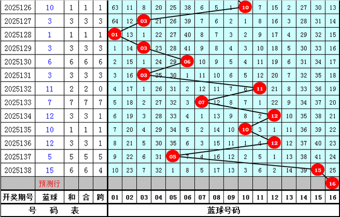 蓝球分析:去年第139期蓝球奖号为14,开出2路蓝球,目前1路蓝球轮空3年,今年同期适当关注1路蓝球回补,看好号码16。