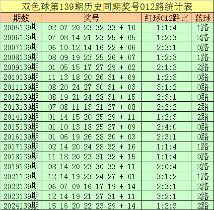福彩双色球第2025139期历史同期王守礼012路奖号遗漏分析: