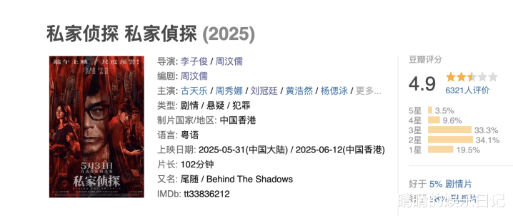 比如今年上半年古天乐有一部新片《私家侦探》,在网络上的评分和口碑就很差。