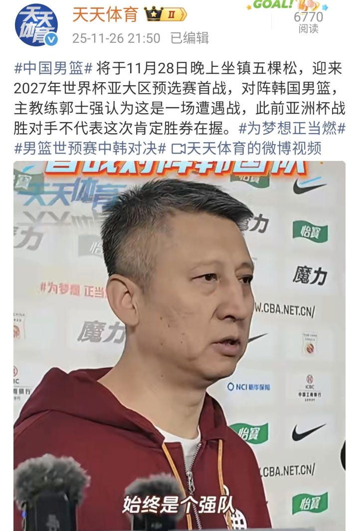中国男篮坐镇五棵松,迎来2027年世界杯亚大区预选赛首战,对阵韩国男篮的比赛, 主教练郭士强认为这是一场遭遇战,同时,这也是中国男篮在世预赛上遇到的第一个对手,首先说,这场比赛“不好打”!