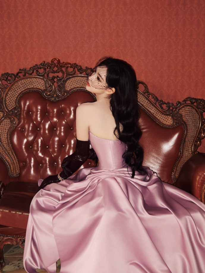 在细节上,搭配的丝绒手套为整体造型增添了一层优雅和贵气,复古感十足。整体穿搭通过色调和材质的巧妙结合,创造了一个经典而优雅的造型。长裙的设计简约但不失细节,各种元素相得益彰,整体看起来和谐且高级。深色的手套和高跟鞋为整体增添了一点复古和神秘的气息,让人联想到贵族的优雅与高贵。
