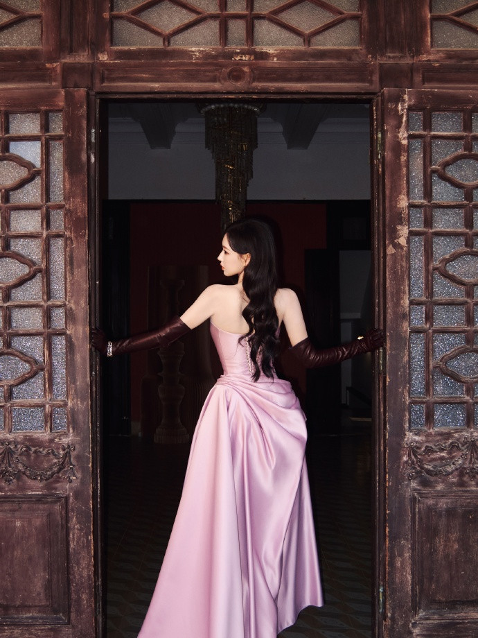 紫色缎面长裙,程潇的这款造型也被网友热议为行走的紫葡萄。裙装采取自身的主色调,不仅显得高贵,而且能够很好地衬托出程潇的肤色,使她看起来更加白皙动人。