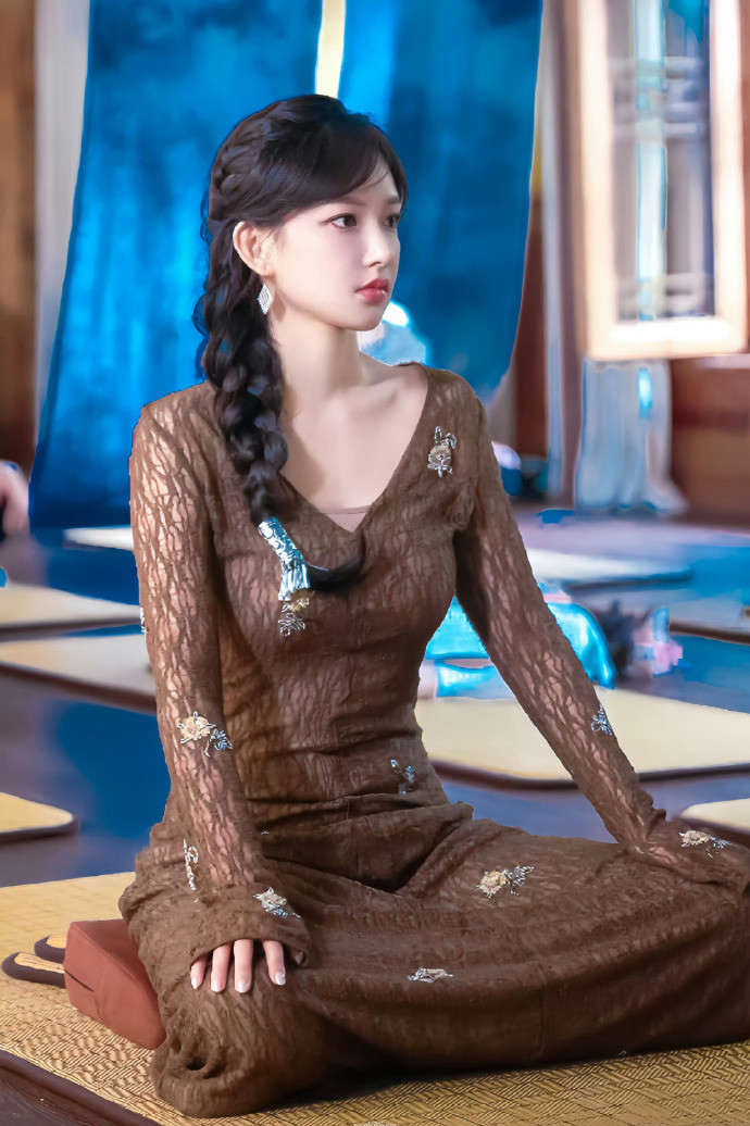 棕色蕾丝拼接渔网长裙,程潇穿搭这款造型也有着将“奶潇”具象化了感觉。裙装通过细腻精致的设计和柔美的材质,呈现出一种复古优雅且梦幻的时尚感。